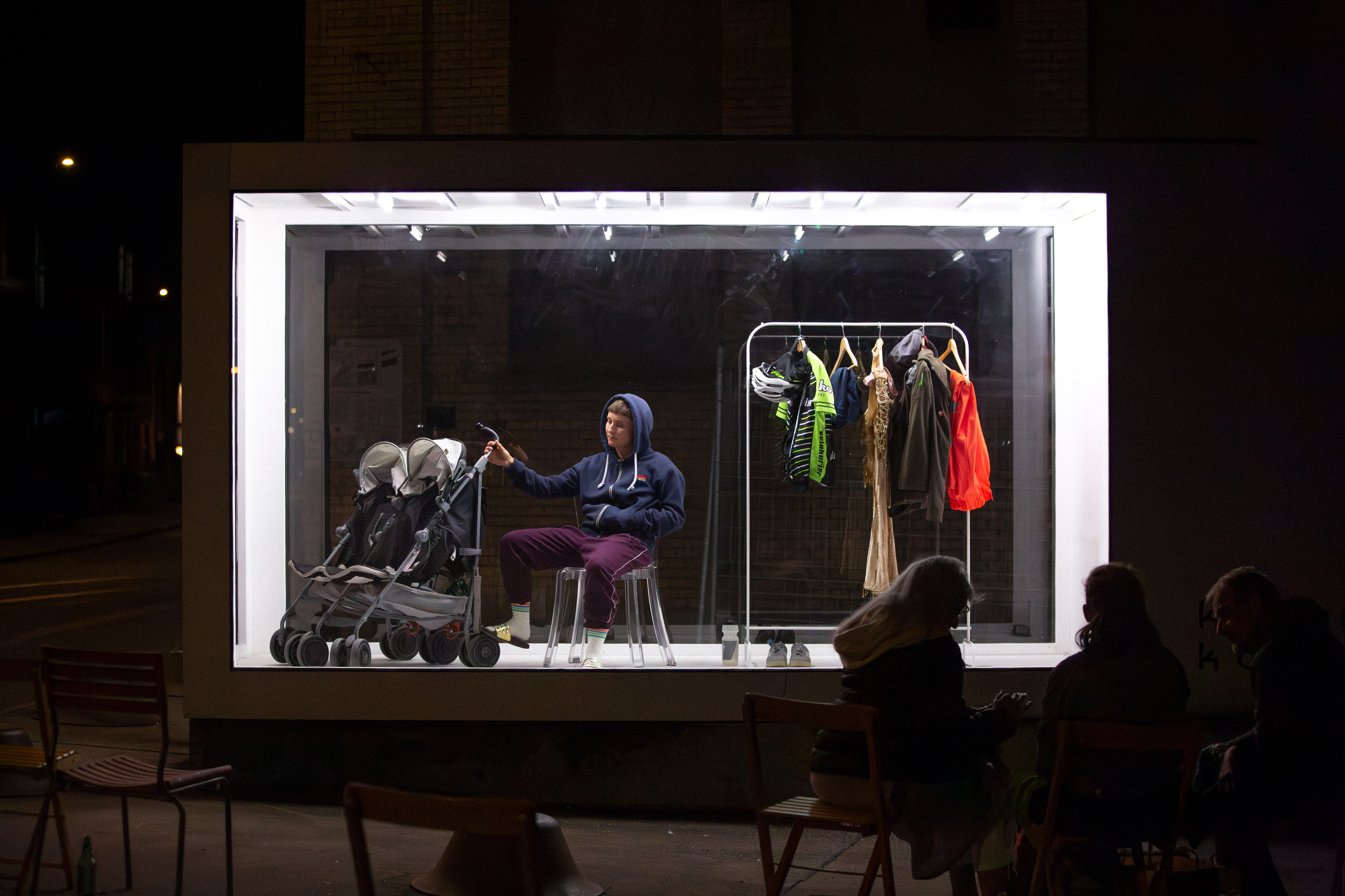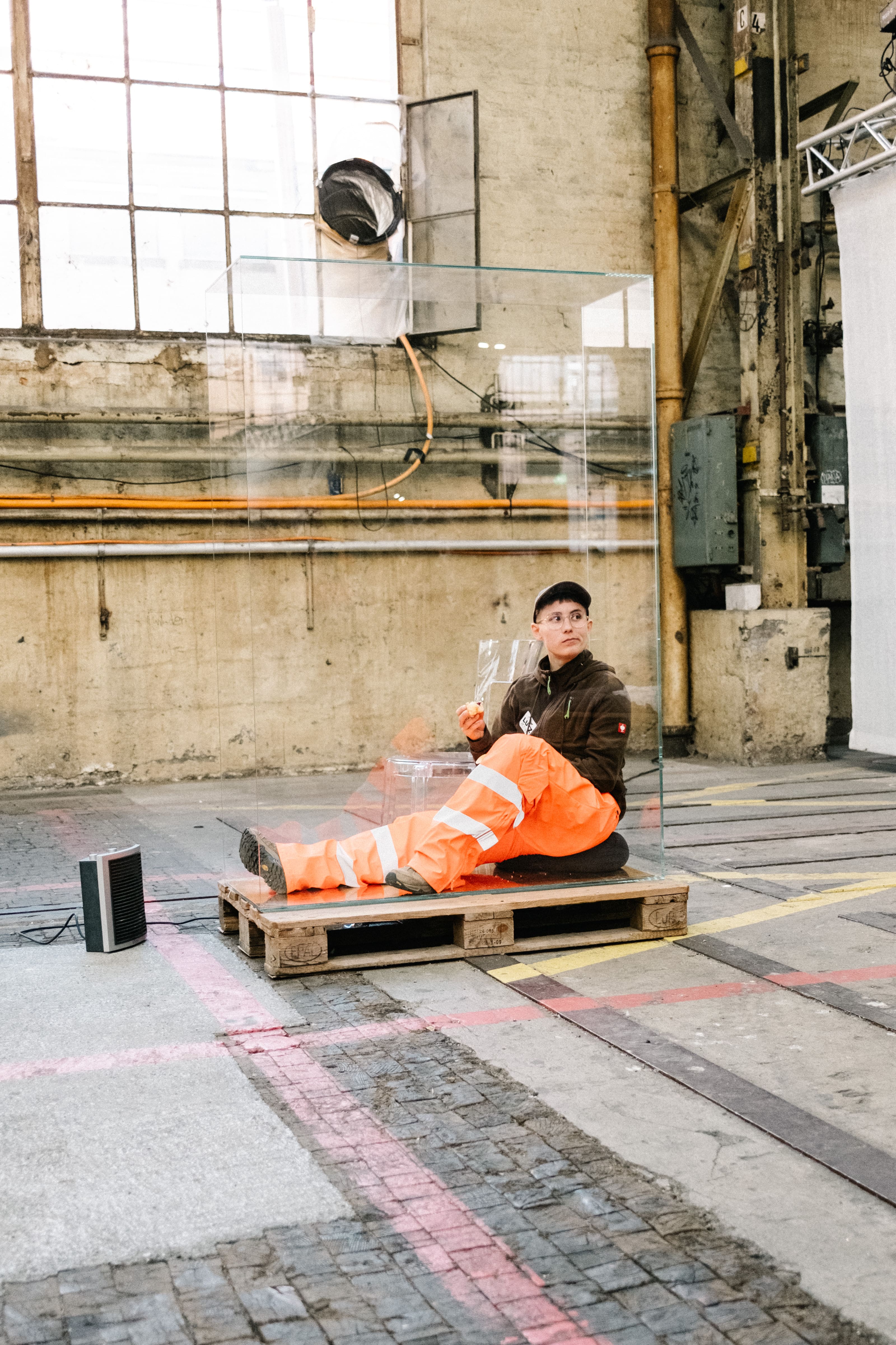 Schaufenster is a long durational solo performance in a glass cube.
